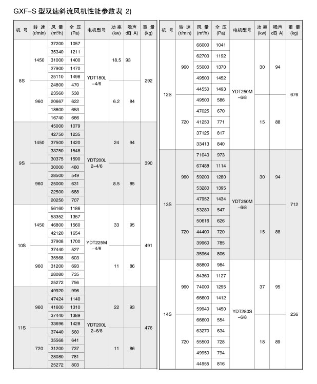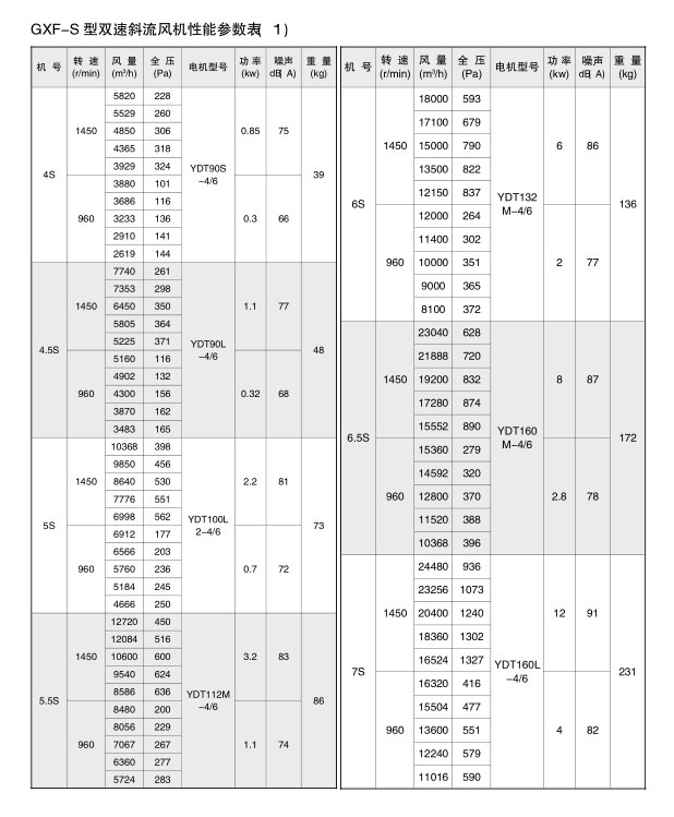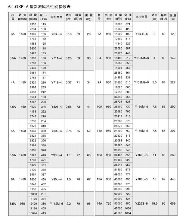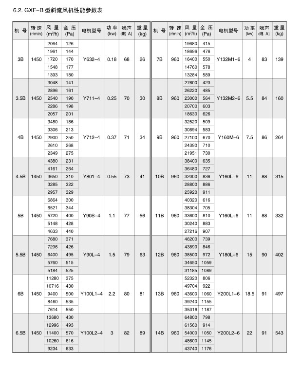 GXF系列斜流通風機按葉輪直徑分為400-1400mm十四規格,按類型分為A、B、C、S四種類型,共五十八個機號。風量由3000-90000m3/h,全壓由185-2500Pa;這樣就給設計部門和用戶單位提供了充分的選擇條件,具體數據請查風機性能參數表。