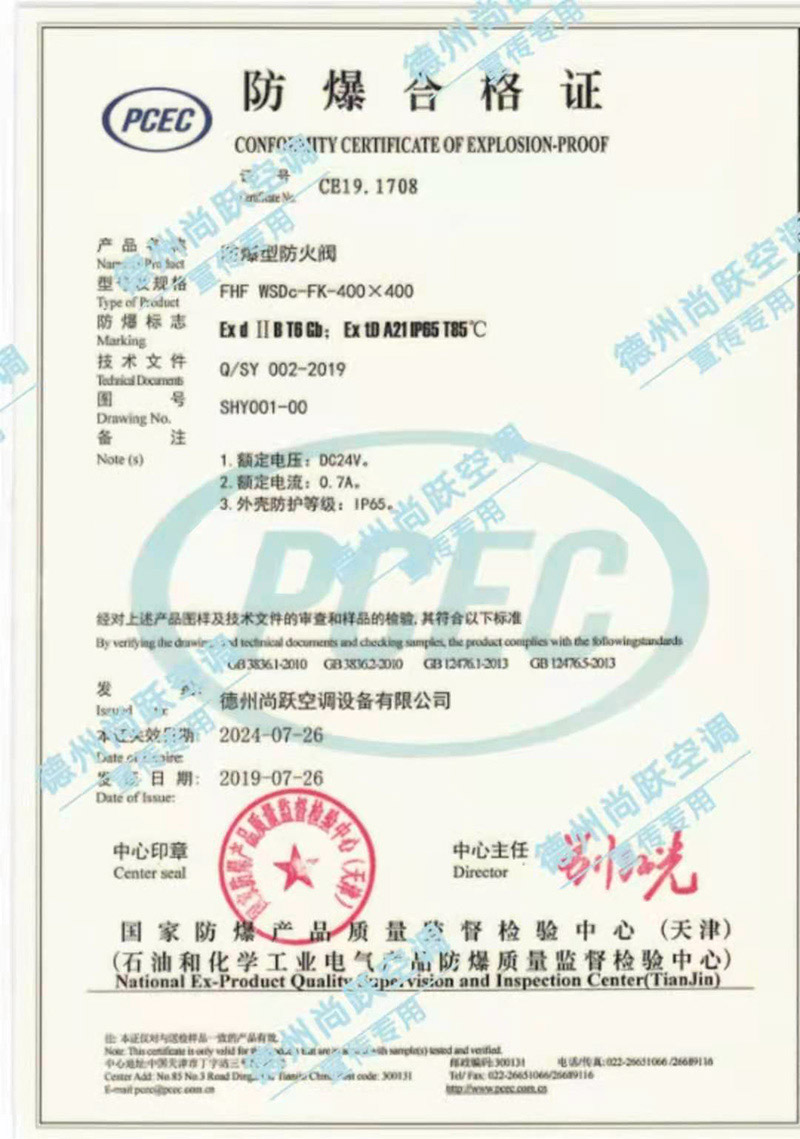 防爆防火閥材質為:外框鍍鋅或不銹鋼材質,葉片鋁合金材質,執行器為防爆,防爆級別為DIIBT4或CT4,根據用戶要求制作。
